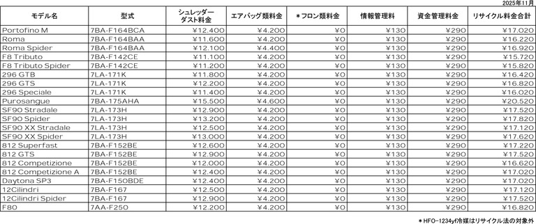 フェラーリ リサイクル料金表